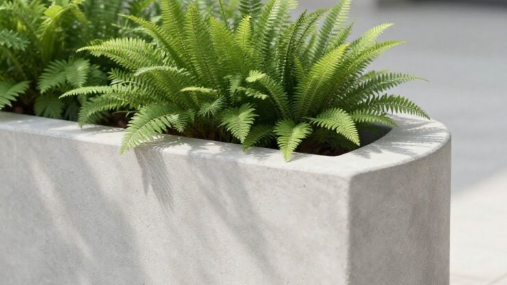 • **Kontrast tekstur:** Gładka powierzchnia betonu pięknie wyeksponuje rośliny o intensywnych teksturach – paprocie, funkie o dużych liściach czy rozłożyste hosty.